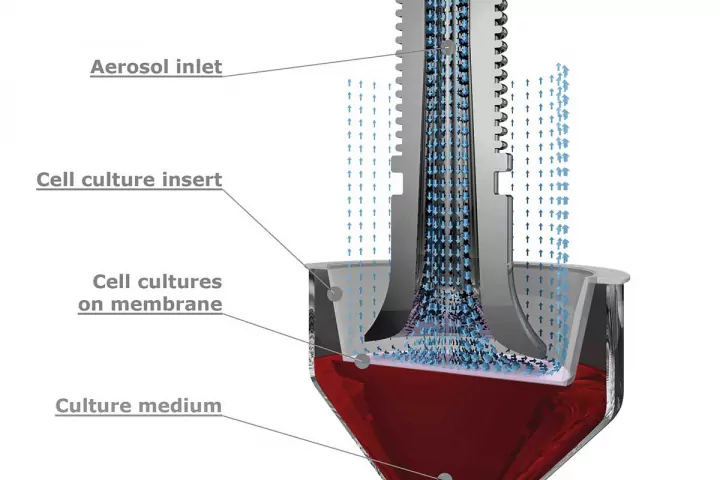 Primary cultures and cell lines, e.g. from the respiratory tract, can be observed in modules specifically designed for direct contact between cells and components of the test atmosphere at the air/liquid interface.