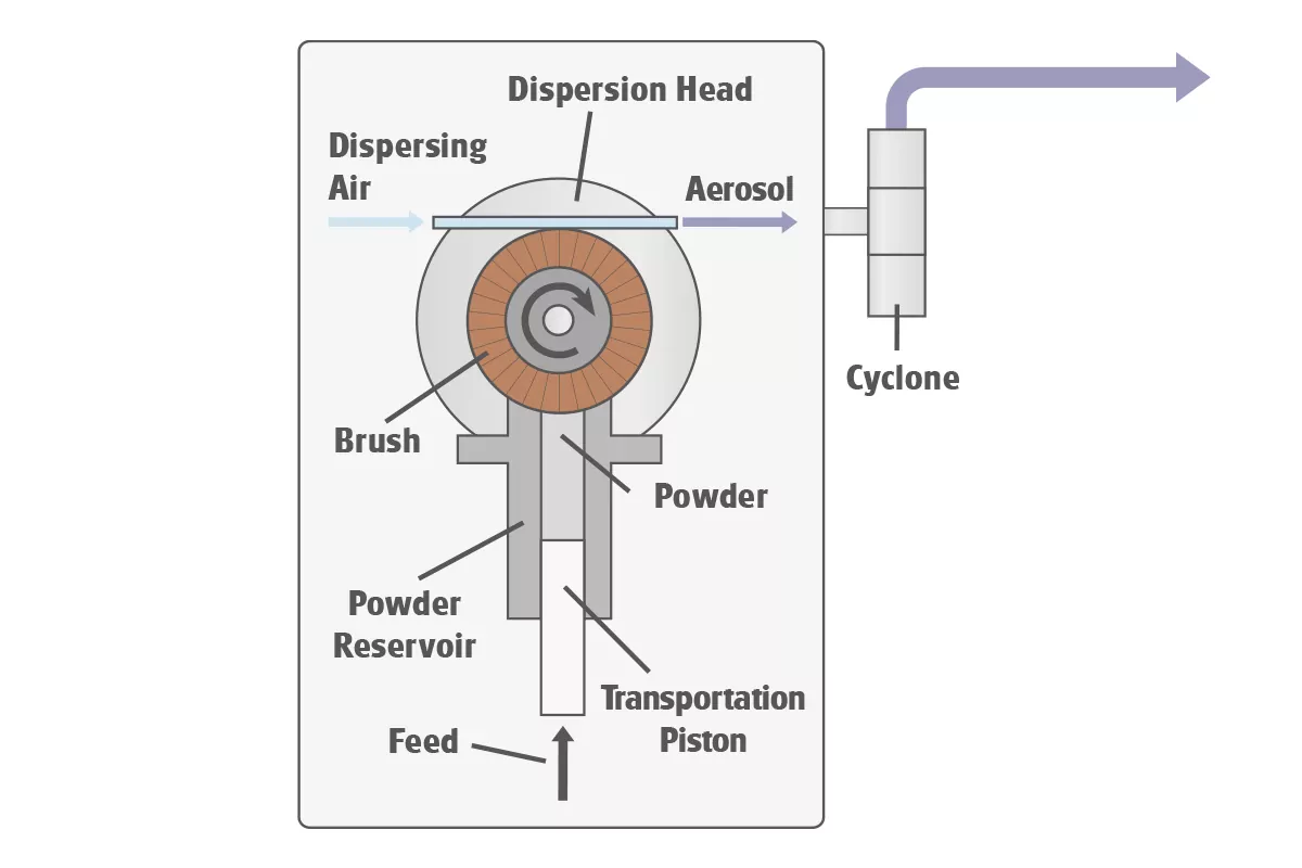 For the generation of polydisperse solid aerosols from bulk powder material.