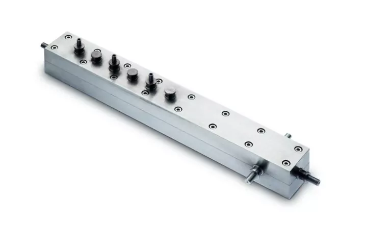 This universal dilution system has entry and exit nozzles for the aerosol stream plus 2 jets for air. 3 or 4 fittings lead to the VITROCELL® module inlets. The inlets aspirate the required dose from the constant flow of diluted test substance through the dilution system.