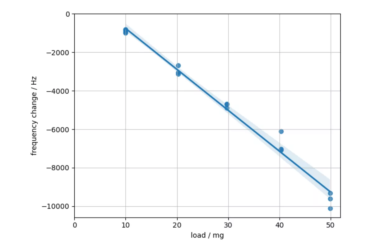 Four sQCM 12 were loaded in parallel with aerosolized dry powder (TiO2). Five independent experiments using different amounts of material show a very high comparability of the four sQCM 12 readouts and their measurement positions. A clear linear response of the raw sensor signals (“frequency change”) to total aerosolized mass (“load”) has been demonstrated.