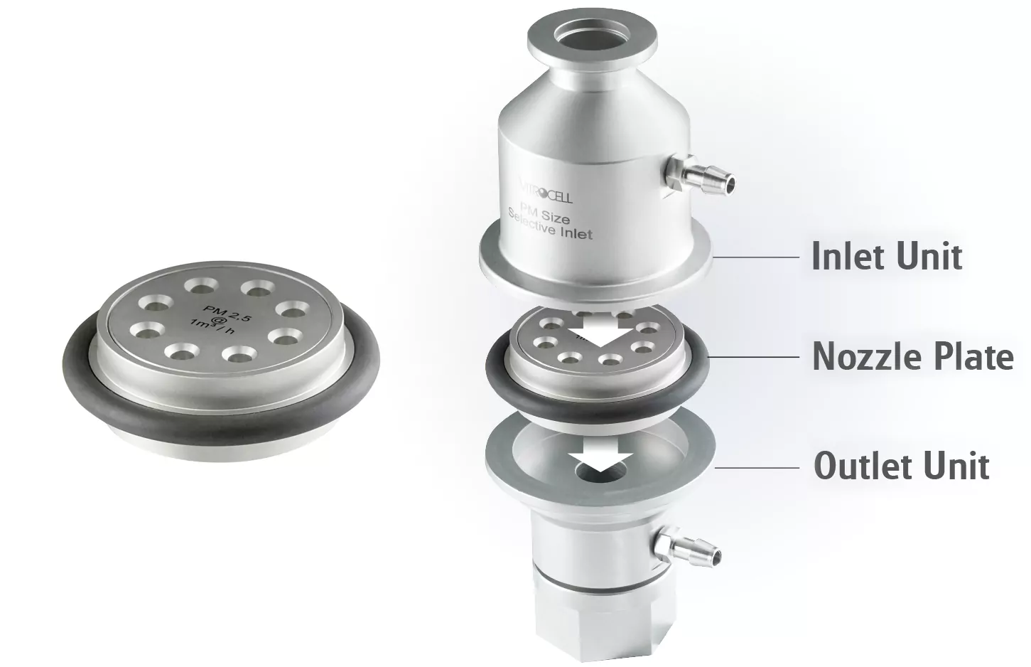 The VITROCELL® adaptable PM inlet separates different fractions of the aerosol before the aerosol is guided into the AirTox Monitor. Depending on the desired particle size and the amount of aerosol available, the PM inlet can be equipped with different nozzle plates.
