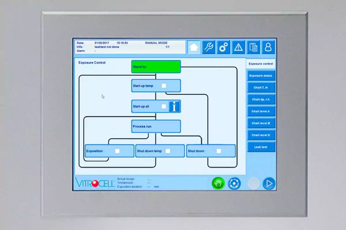 All key functions for successful exposure such as, aerosol flow rates, humidity, temperature and leak test are edited by touch-screen prior to the experiment. The respective data is shown on live graphs and stored for further analysis. The cells are exposed at the air/liquid interface on 6/12/24-well sized cell culture inserts.