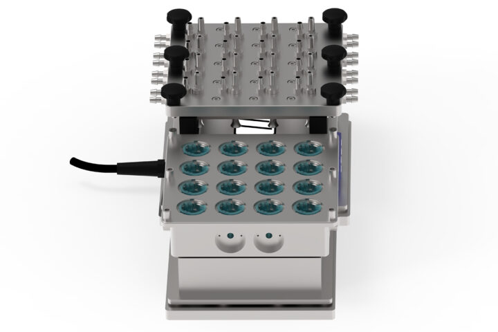The aerosol inlets are connected to the distribution or dilution systems. Extraction from the module takes place via small holes using a controlled vacuum flow. VITROCELL® calibration valves, which are connected to a vacuum pump control flow rates effectively. The aerosol exposure top features an in/outlet for heating the water circuit, ensuring corresponding temperatures with the base module. It is made of high-quality anodized aluminum.