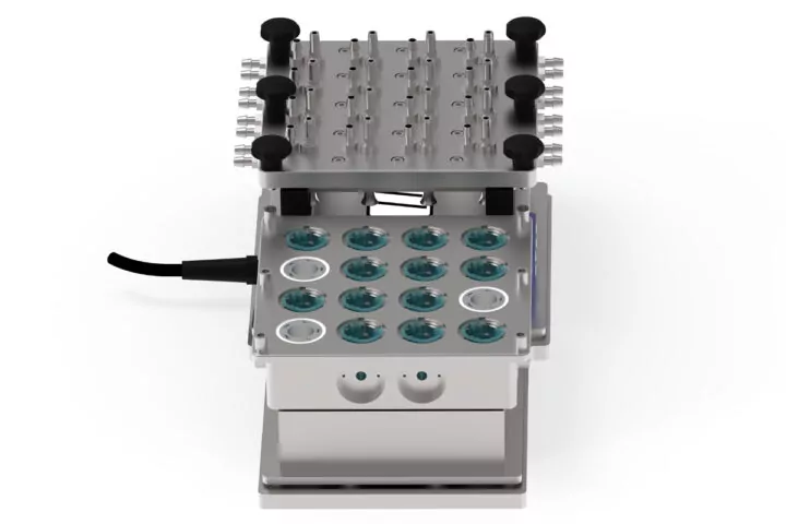 The aerosol inlets are connected to the distribution or dilution systems. Extraction from the module takes place via small holes using a controlled vacuum flow. VITROCELL® calibration valves, which are connected to a vacuum pump control flow rates effectively. The aerosol exposure top features an in/outlet for heating the water circuit, ensuring corresponding temperatures with the base module. It is made of high-quality anodized aluminum.