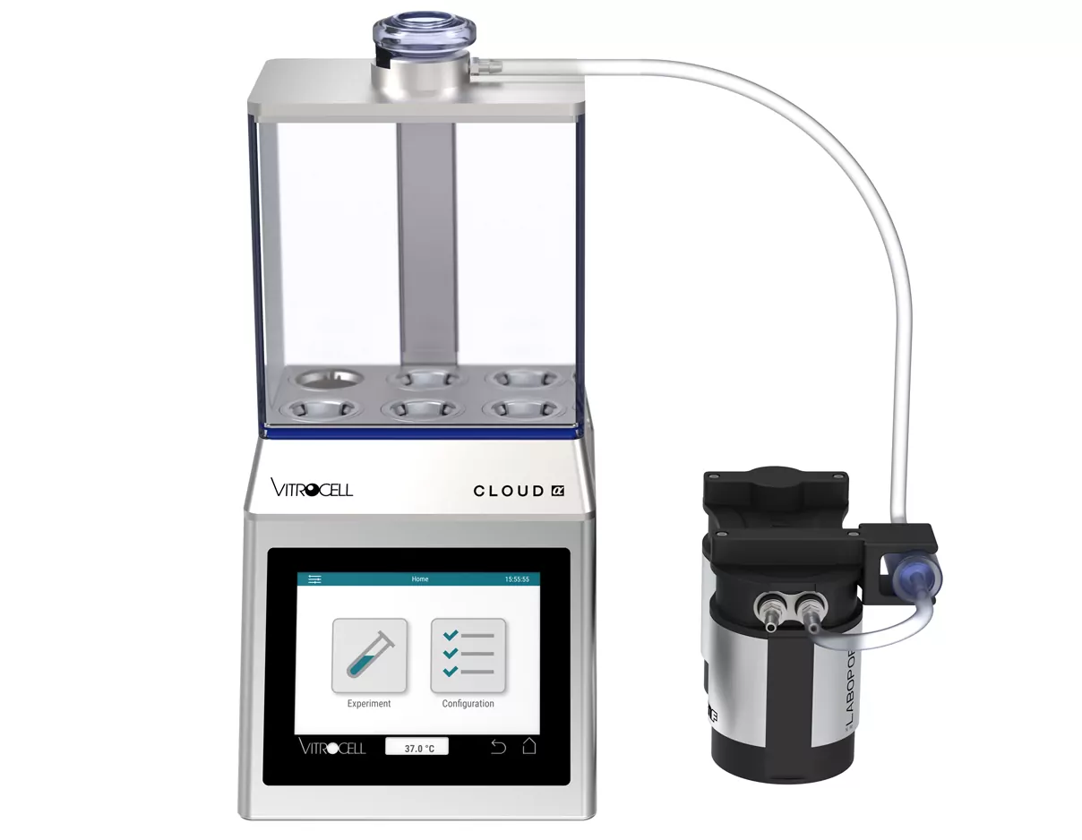 A typical Cloud exposure allows 3 consecutive nebulizations. The PowerVent option enables an increase of the dose by adding further nebulizations. After each nebulization the humidity is removed by a short venting period before starting the new one. The venting function can be edited in the software. The PowerVent unit is delivered ready-to-use with an integrated vacuum pump.