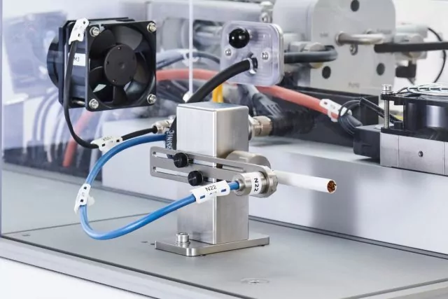 The control box houses the controls for the stepper motors, sensors and pneumatic valves. The whole process is controlled by Beckhoff software in conjunction with Microsoft Windows 10®. This setup offers extensive possibilities for integration with common Microsoft Office® applications and the exchange of data with Excel®-sheets.