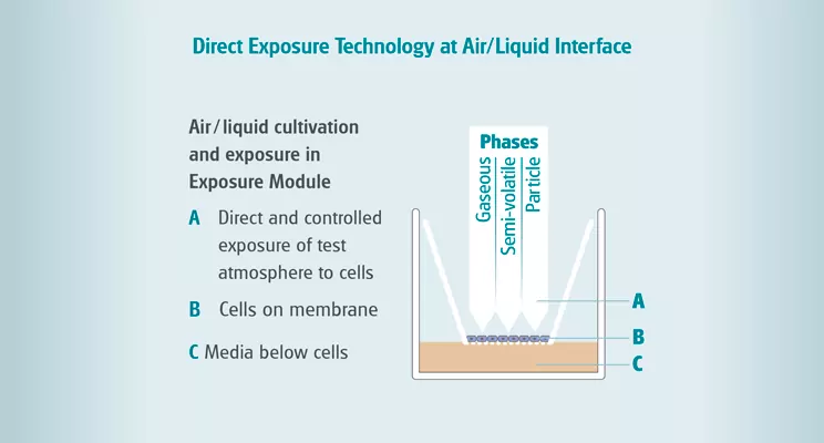 In the direct air/liquid interface exposure method, mammalian cells or tissues are exposed to airborne substances without being covered with culture media, unlike in submerged exposure. This approach more closely replicates human physiology, allowing for more credible and authentic results than those obtained through submerged exposure.
