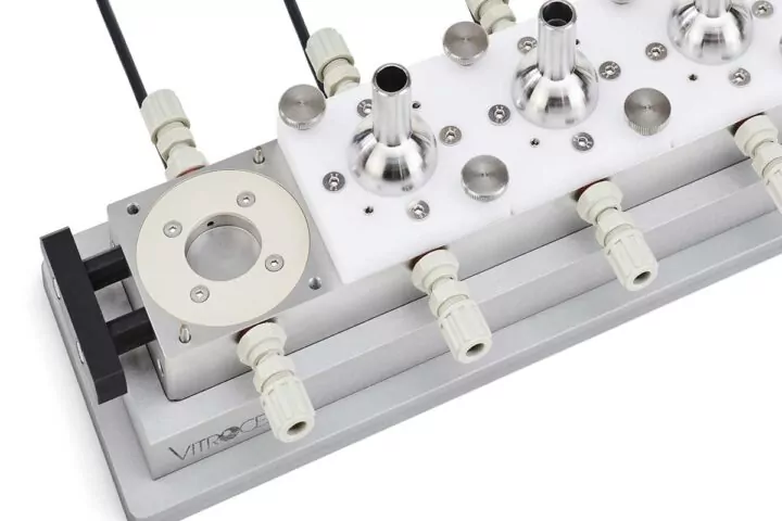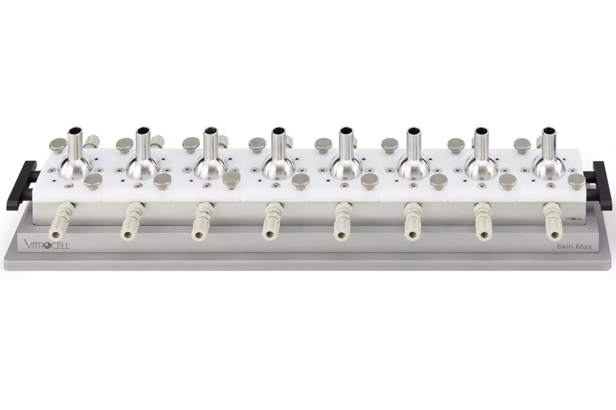 The VITROCELL® Skin Max module is a unique system with 8 chambers for tissue exposure. The base module and covers are made of high-quality stainless steel. This module is a superior alternative to Franz cells.