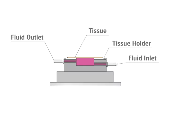 The skin module is used for samples with a surface smaller than approx 4.9 cm2. The unique tissue holders have been specifically designed to enable tight and reliable skin fixation. Alternatively, cell culture inserts may be used.