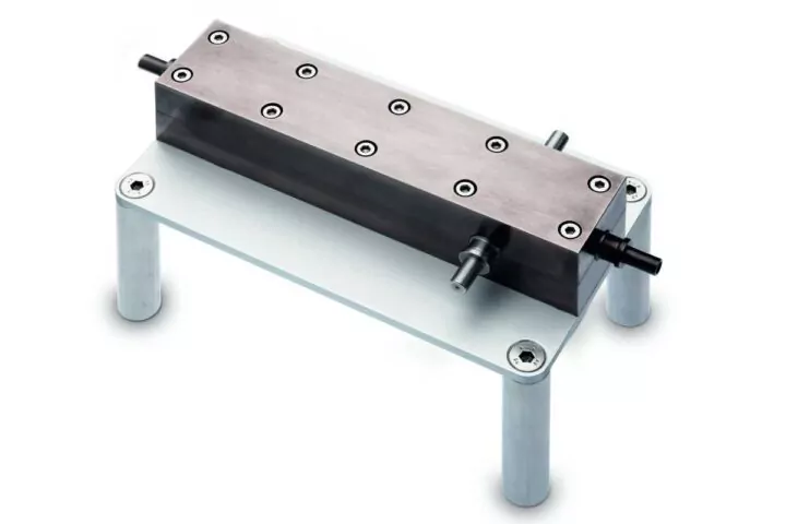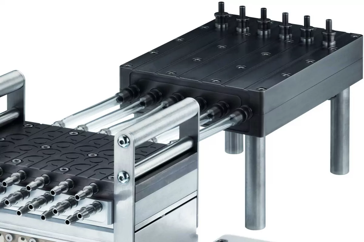 This universal dilution system has entry and exit nozzles for the aerosol stream plus 2 jets for air. 3 or 4 fittings lead to the VITROCELL® module inlets. The inlets aspirate the required dose from the constant flow of diluted test substance through the dilution system.