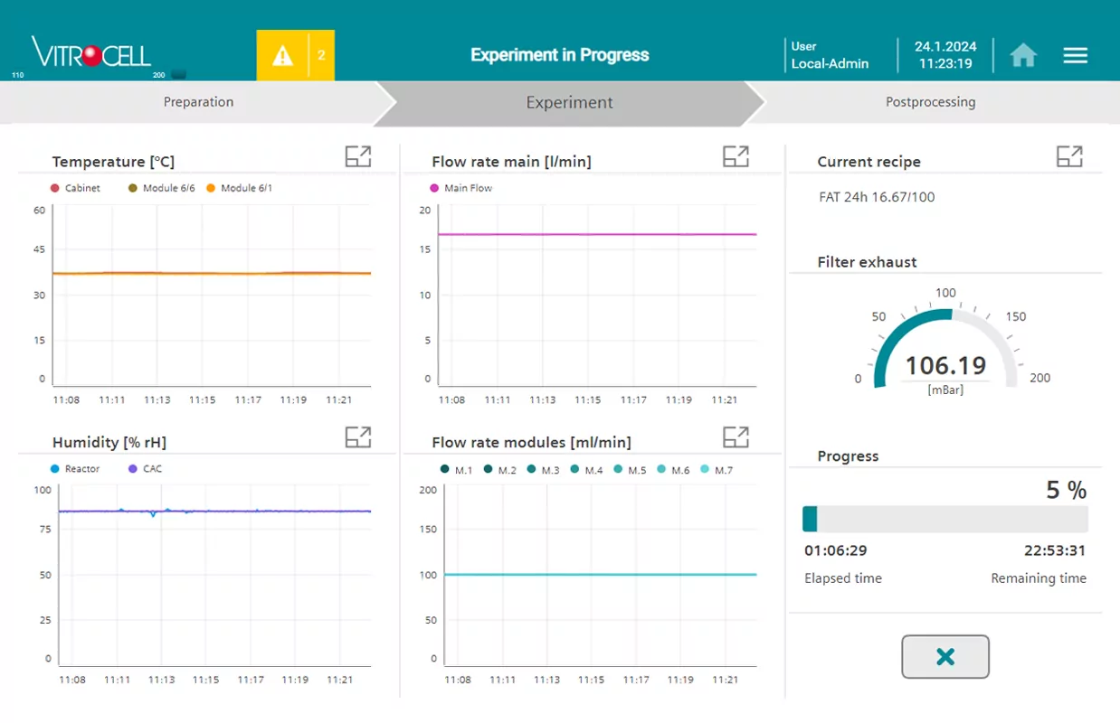 The VITROCELL® AirTox Monitor ensures this reproducibility by a user-friendly control software. All relevant process stepsof the cell exposure are automatically prepared and relevant parameters such as temperature, humidity and flow rates are exactly controlled to target values of the recipes.
