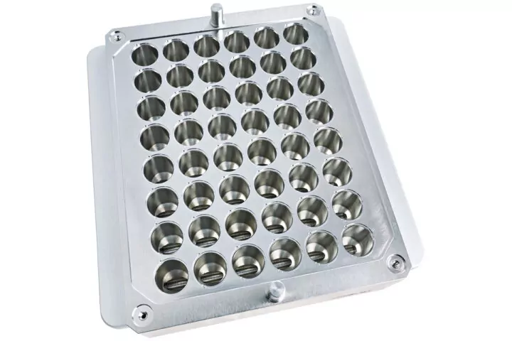 The base module with 48 wells (24-well-size) is made of electropolished stainless steel. An optional transparent control window facilitates the external monitoring of media levels and may be easily removed from the integrated heating base. Temperature can be programmed individually.