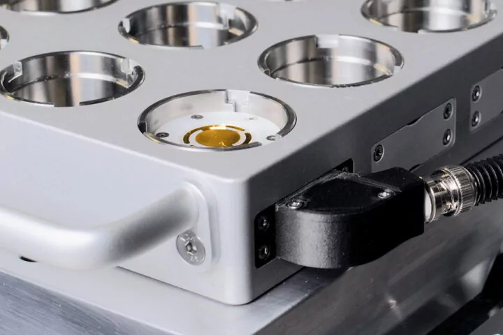 The docking station with special sealing and connection mechanisms guarantee a hermetic connection of the base module with the aerosol exposure top.