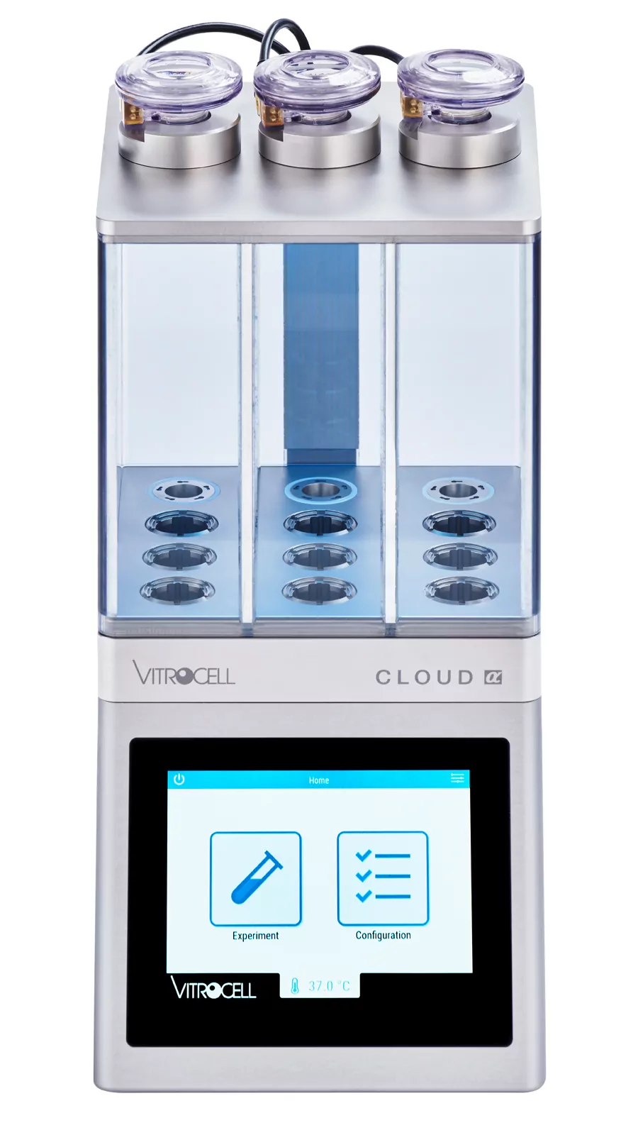 The VITROCELL® Cloud Alpha TRIO presents another innovative leap forward in the exposure of cell cultures. This versatile device enables the acquisition of three dose relationships in a single experiment or facilitates working with three different substances simultaneously. The latter procedure is particularly interesting for users which need to test and compare larger numbers of different substances. The development is based on the well-known and frequently published VITROCELL® Cloud formats.