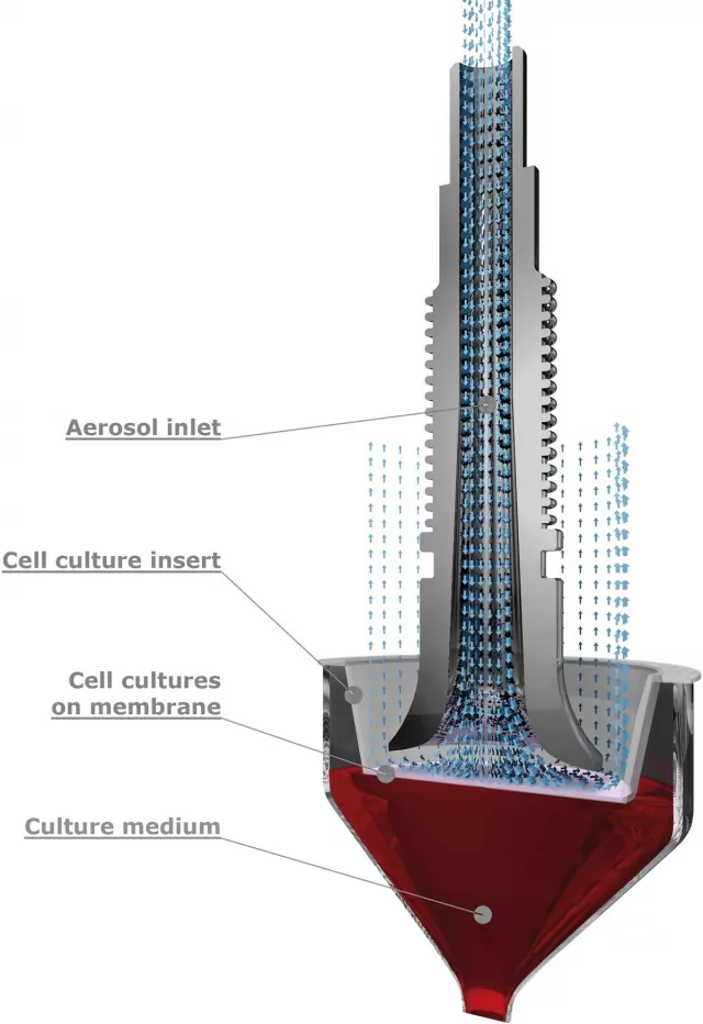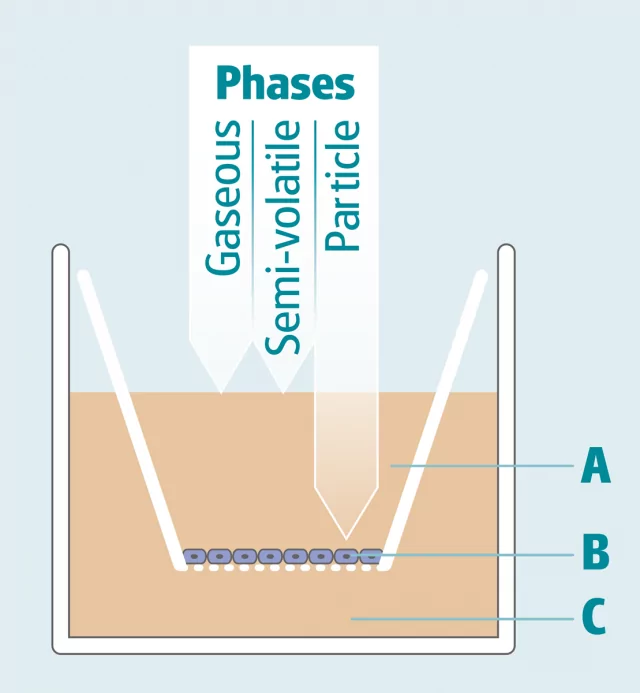 The exposure of mammalian cells or tissues to airborne substances is frequently performed under submerged conditions. In doing so, the test substances are dosed into the culture medium. This procedure results in an undesired interaction of the formerly airborne substances with the medium, causing limitations for authentic analysis.