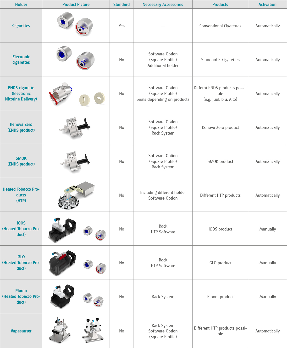 The configuration for cigarette holders for the VITROCELL® Smoking Machine VC 10 S-Type as download file (PDF) or see below: