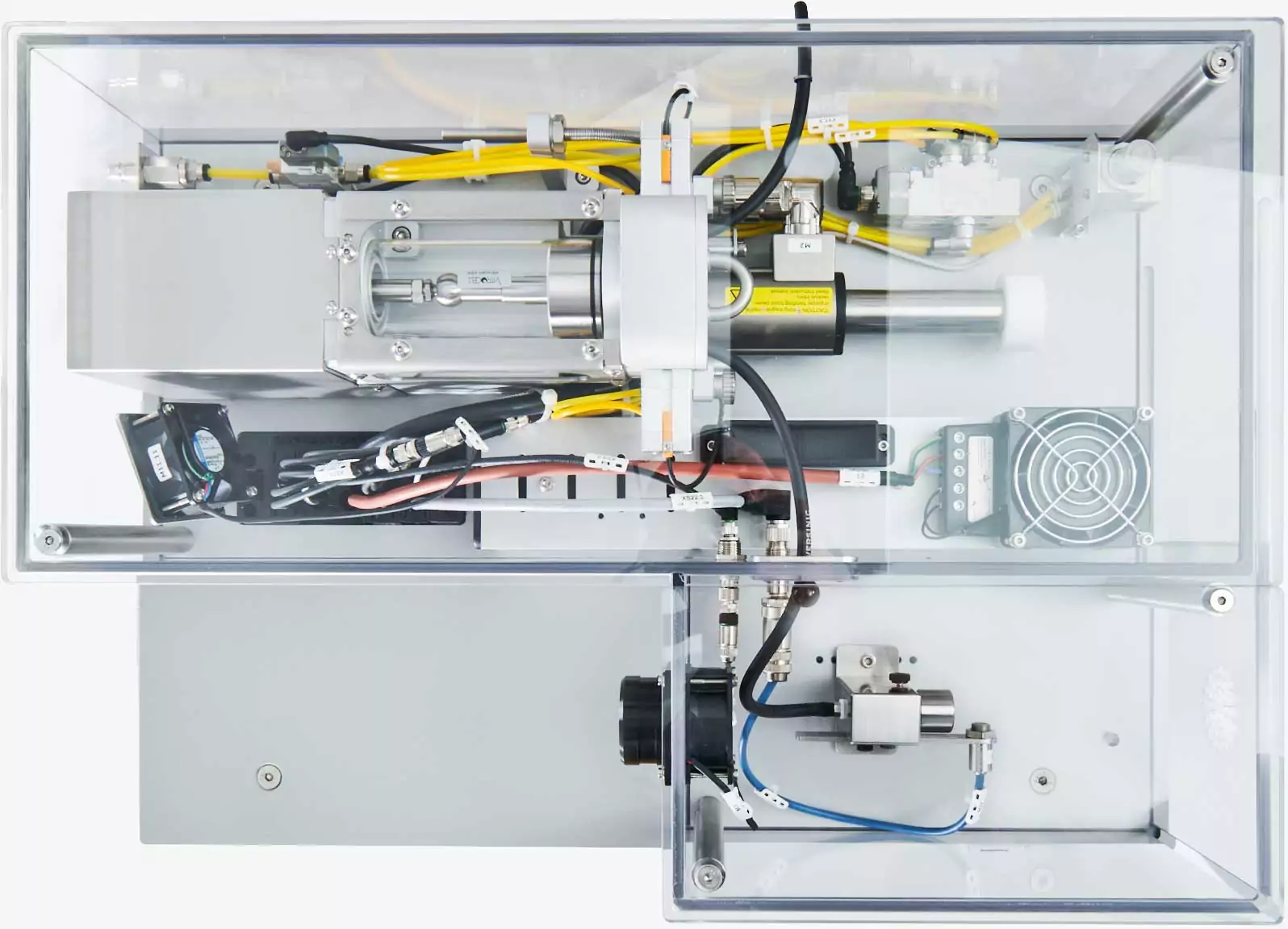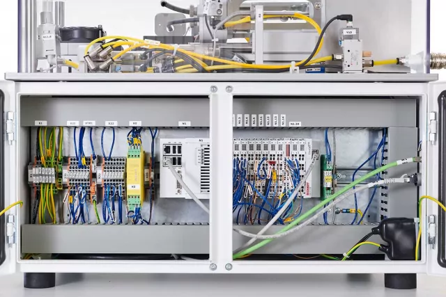 The control box houses the controls for the stepper motors, sensors and pneumatic valves. The whole process is controlled by Beckhoff software in conjunction with Microsoft Windows 10®. This setup offers extensive possibilities for integration with common Microsoft Office® applications and the exchange of data with Excel®-sheets.
