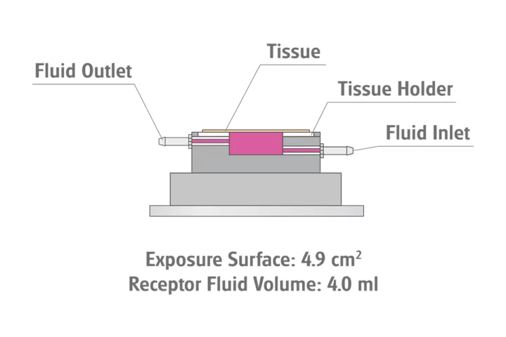 The skin module is used for samples with a surface smaller than approx 4.9 cm2. The unique tissue holders have been specifically designed to enable tight and reliable skin fixation. Alternatively, cell culture inserts may be used.