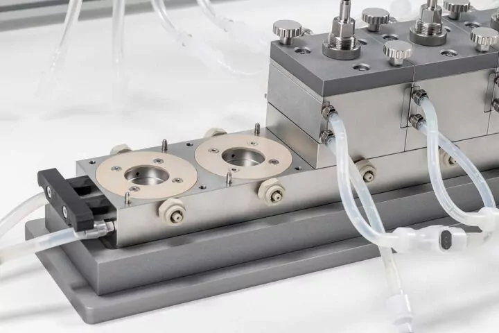 The aerosol inlet stream flows through specifically shaped inlets. Aerosol inlets are connected to the VITROCELL® distribution or dilution systems. VITROCELL® calibration valves, which are connected to a vacuum pump, control flow rates over the issue effectively. The aerosol exposure tops feature an in/outlet for heating the water circuit, ensuring corresponding temperatures with the base module.
